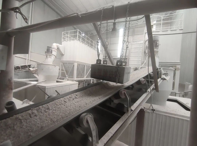 隨后礦石將被輸送入一級(jí)鄂式破碎機(jī)破碎至150毫米以下,同時(shí)均勻落在底部皮帶輸送機(jī)上?,F(xiàn)場(chǎng)工作人員負(fù)責(zé)檢查篩選出皮帶上的低品位礦石,以有效提高礦石的白度與品位。經(jīng)過(guò)挑選后再次進(jìn)入二級(jí)錘式破碎機(jī),進(jìn)一步細(xì)碎。