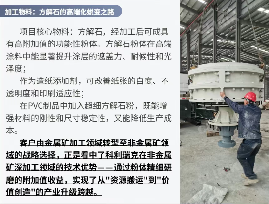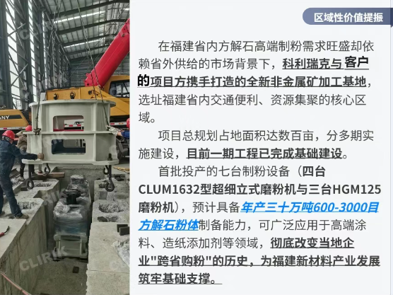 在國(guó)家大力推進(jìn)新型工業(yè)、加快發(fā)展新質(zhì)生產(chǎn)力的戰(zhàn)略背景下,非金屬礦加工行業(yè)正迎來(lái)智能化、綠色化、高端化轉(zhuǎn)型的窗口期。隨著《"十四五"原材料工業(yè)發(fā)展規(guī)劃》對(duì)非金屬礦物材料產(chǎn)業(yè)高質(zhì)量發(fā)展的明確指引,以及高端制造業(yè)對(duì)超細(xì)粉體材料需求的持續(xù)攀升,行業(yè)已從傳統(tǒng)加工模式向"精細(xì)化、功能化、集群化"發(fā)展階段加速邁進(jìn)。作為非金屬礦加工領(lǐng)域的重要技術(shù)參與者,科利瑞克深度參與的福建方解石制粉項(xiàng)目,正是這一區(qū)域性變革項(xiàng)目的落地,該省級(jí)示范工程——不僅填補(bǔ)了福建區(qū)域性自造高端方解石粉體生產(chǎn)的空白,更通過(guò)"設(shè)備集群+智能工藝+綠色布局"的創(chuàng)新模式,為非金屬礦行業(yè)轉(zhuǎn)型升級(jí)提供了可復(fù)制的解決方案。