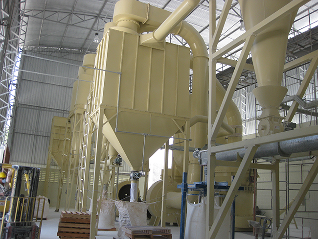 形狀較大的陶土首先由破碎設(shè)備破碎成陶土磨粉機(jī)所需粒度,斗式提升機(jī)負(fù)責(zé)將經(jīng)過破碎加工的陶土送入儲(chǔ)料斗,之后使用振動(dòng)給料機(jī)將儲(chǔ)料斗內(nèi)的物料送進(jìn)陶土磨粉機(jī)主機(jī)磨室內(nèi),經(jīng)過磨輥與磨環(huán)的相互作用實(shí)現(xiàn)物料的破碎,粉磨完成后,經(jīng)過粉磨的物料粉子在鼓風(fēng)機(jī)的作用下進(jìn)入選粉機(jī),選粉機(jī)選出符合粒度要求的陶土物料,進(jìn)入成品收集器內(nèi),不符合要求的陶土物料重新返回磨室內(nèi)進(jìn)行磨粉加工。